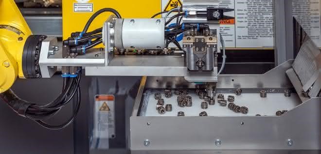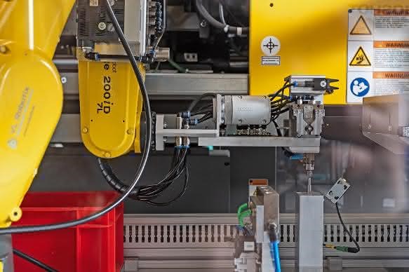 Kombiniert wurden in der Zelle die vollelektrische Spritzgießmaschine Roboshot und ein LR Mate Roboter in der die Langarmversion mit 7 Kilogramm Traglast und 911 Millimeter Reichweite. Die Zuführtechnik mit Kamerasystem steuert der Roboter. Die Kommunikation zwischen Roboter und Spritzgießmaschine nutzt die die Fanuc-eigene digitale Schnittstelle, die gegenüber der üblichen Euromap 67-Schnittstelle mehrere Funktionen abbilden soll. Dank dieser Integration könne die Anlage von der Spritzgießmaschine aus gestartet, gestoppt und entstört werden. Somit sollen auch angelernte Bediener ohne Programmierkenntnisse die Produktion aufrechterhalten können.